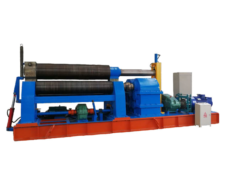 本機(jī)為對(duì)稱(chēng)式三輥卷板機(jī),兩下輥為主動(dòng)固定輥,上輥通過(guò)升降絲桿、渦輪、蝸桿在兩下輥對(duì)稱(chēng)中央作上下移動(dòng),兩下輥的正、反旋轉(zhuǎn)和上輥的升降移動(dòng)均靠電機(jī)帶動(dòng)減速器來(lái)完成,并能借助手動(dòng)離合器把上輥調(diào)節(jié)成平行或傾斜位置,以適應(yīng)卷制圓形和錐形工件的需要;并設(shè)有液壓倒頭翻轉(zhuǎn)和液壓壓緊上桿裝置,由電器控制,取代了一般人工倒頭和人工壓緊上桿的操作方法;渦輪上下配有特種壓力軸承,轉(zhuǎn)動(dòng)輕松、省電耐磨。該機(jī)設(shè)計(jì)先進(jìn)、自動(dòng)化程度高,全電控操作,使用方便、省時(shí)、省力。